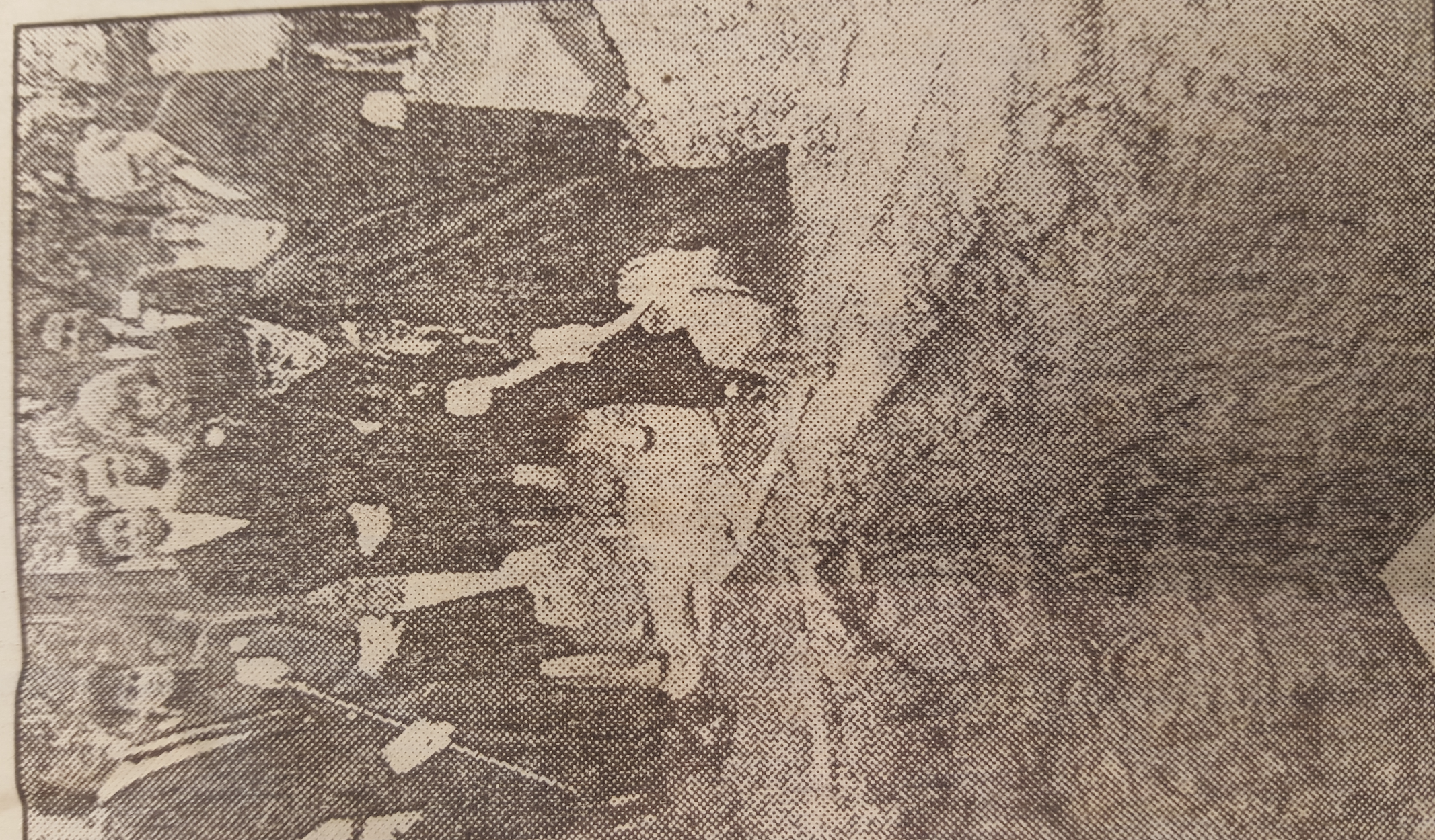 Al: I love this card. It again is a real photo card. The paper was manufactured starting in 1950. The blue lettering on the left says “swimming pool.” I wonder what game the writer marched into wearing blue jeans?