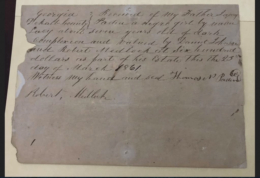“Georgia, DeKalb County. Received of my father James Paden a negro girl by name Lucy about seven years old of dark complexion and valued by Daniel Johnson and Robert Medlock at six hundred dollars, as part of his estate this 25th day of March 1861. Witness my hand and seal Thomas N Paden. Robert Medlock”[5]