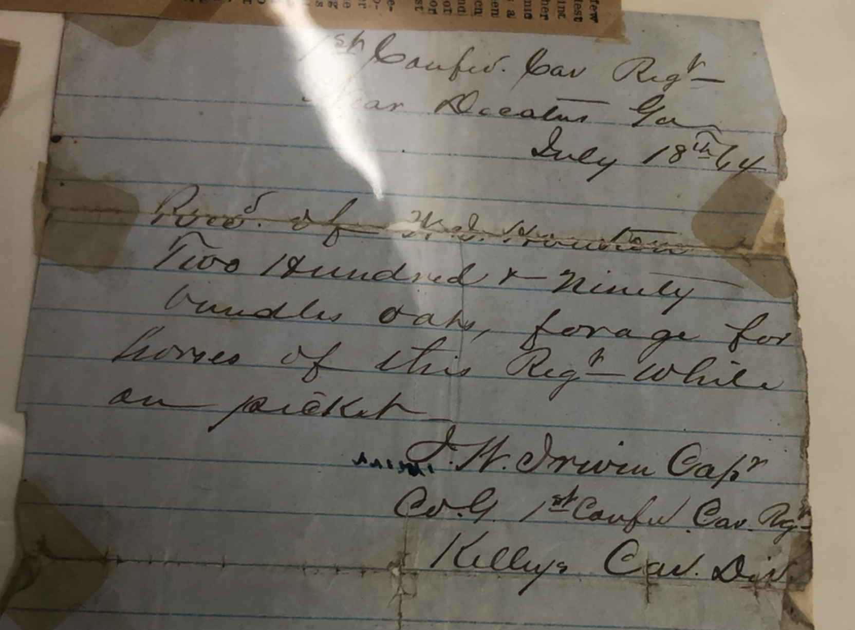 [2] A brief regimental history records a Captain J. U. Irwin with the First Cavalry, slightly misidentifying the officer who signed the receipt. Tennesseans in the Civil War, Vol 1. 1964. Civil War Centennial Commission of Tennessee.