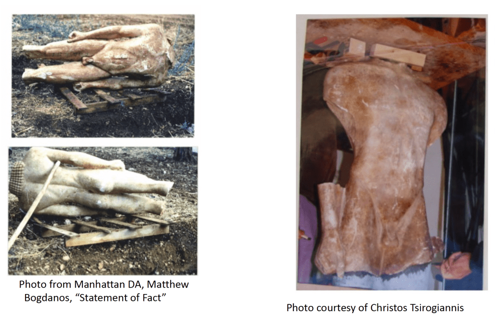 Hecht’s notion that he was rescuing objects for the benefit of humanity feels like a bitter joke when we look at an example of a looted object in whose trafficking he played a key role. The photos below, of a kouros (statue of a young man), show what can happen to an ancient object that is illicitly dug up.