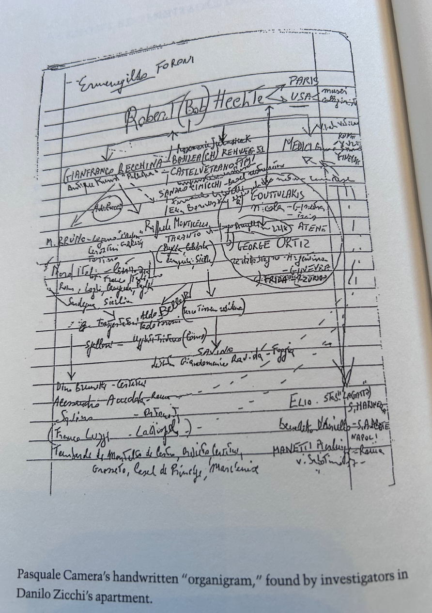 Bob Hecht on Bob Hecht has proved useful in providing important details of his association with other traffickers and dealers, his numerous partnerships, and names of his various galleries, clients, and customers, which include museums and prominent collectors who donate to museums. An “organigram” discovered by authorities in 1995 in the Rome apartment of a member of Hecht’s trafficking network provides details.